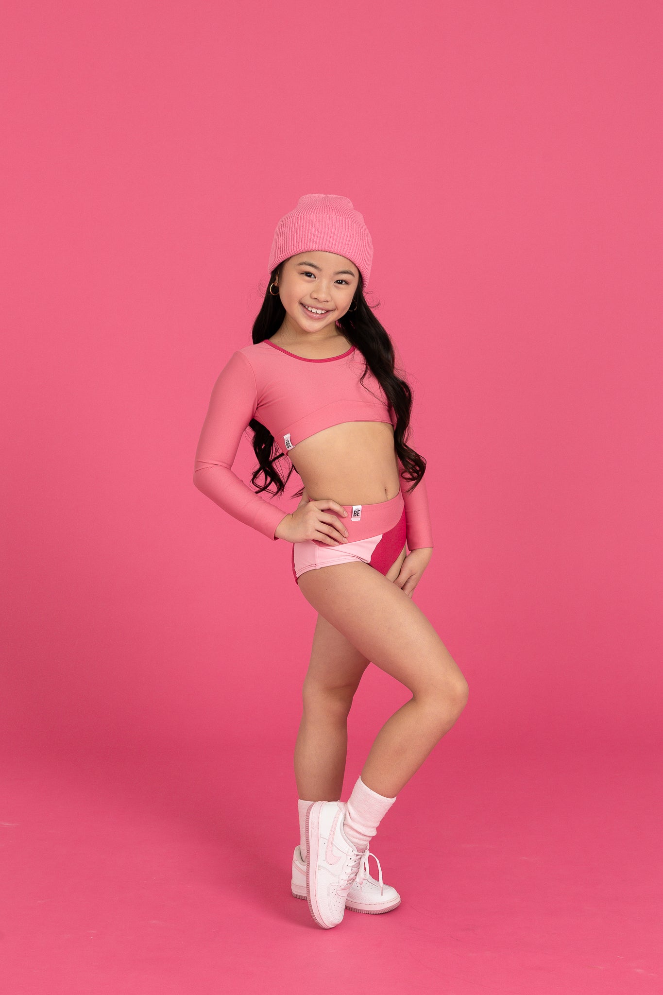 This long-sleeve dance top features a crop top design, scoop neck, and form-fitting arm emphasizing your gorgeous lines to the tips of your fingers. Pairs exceptionally well with coordinating Infinity Briefs,Solid Briefs, and My Girl Shorties.