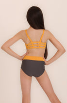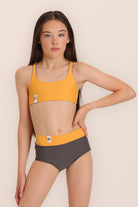 As comfortable as it is versatile, the high-waisted Sun/Shadow BEversatile Duo Brief is ready for anything! The flattering fit is fully lined for modesty and offers squat-proof, stay-in-place coverage. Giving you yet another fabulous look to add to your dance wardrobe, the predominantly gray brief features a soft elastic-free waistband made of yellow spandex. Whether you choose to wear your BEversatile Swap Top with the golden yellow or cool gray side out, your comfy Sun/Shadow Duo Brief will look amazing.
