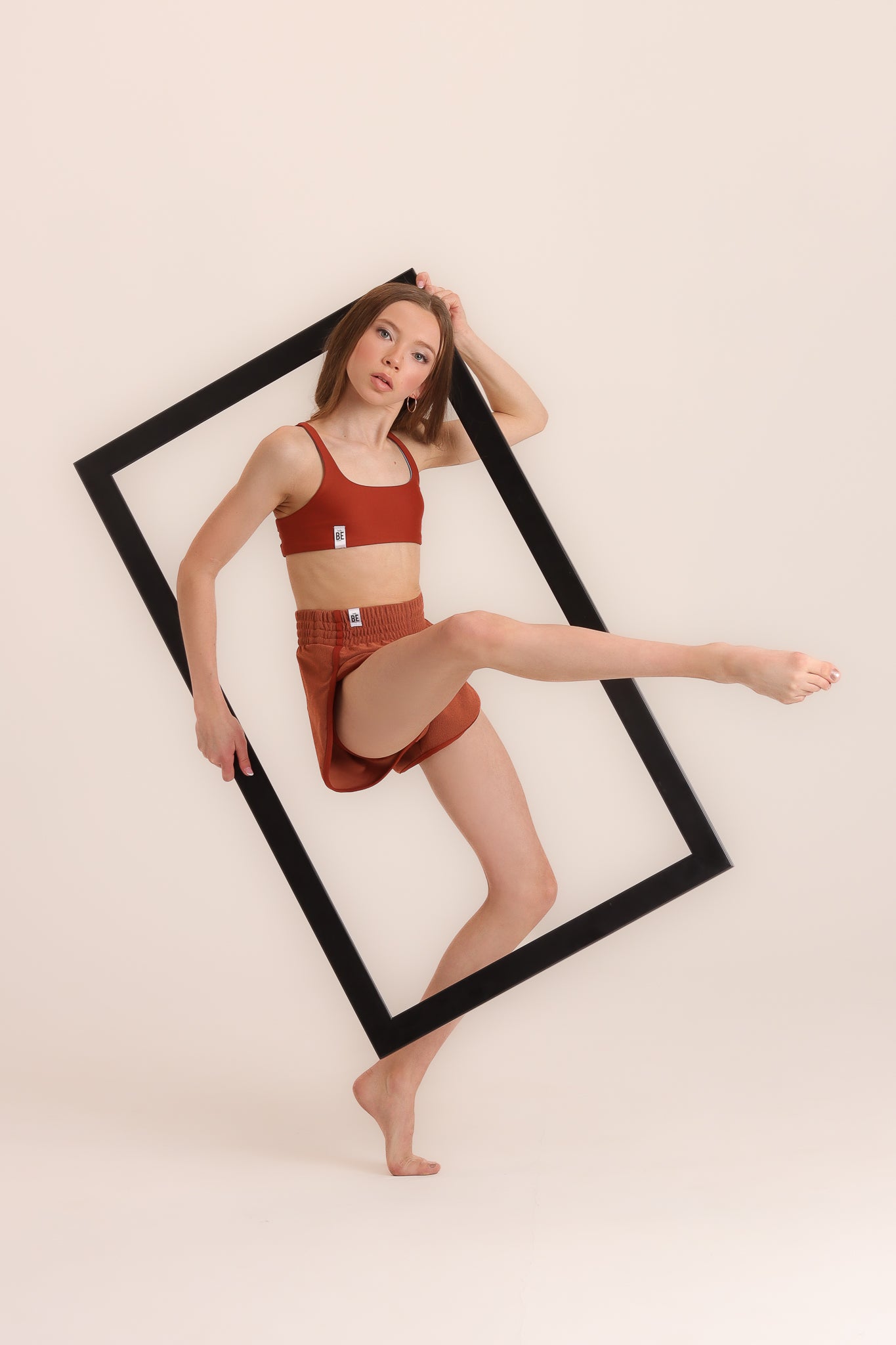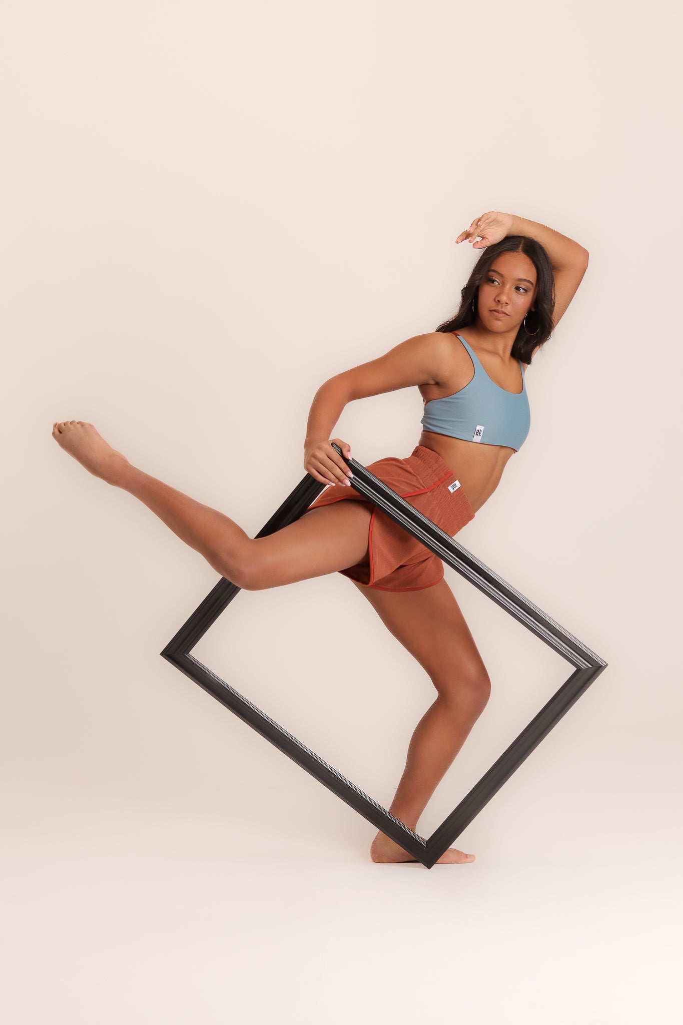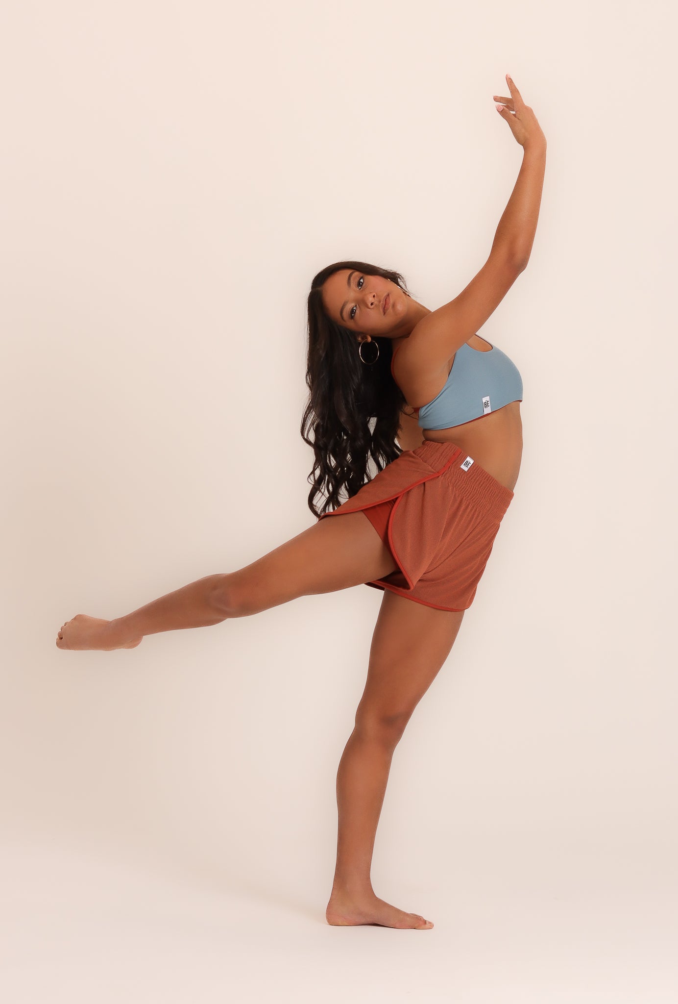 Looking for a little more coverage? The BEversatile Fighters might just be the cutest pull-on shorts ever (and they even bring a little fabric diversity to the mix). Made from textured polyester spandex, they are not only soft and cozy to the touch but will move with you in all directions. Featuring open side seams and coordinating trim, the clay BEversatile Fighter Short is designed to be worn over the Clay/Mist Duo Brief or the Clay Booty Short.
