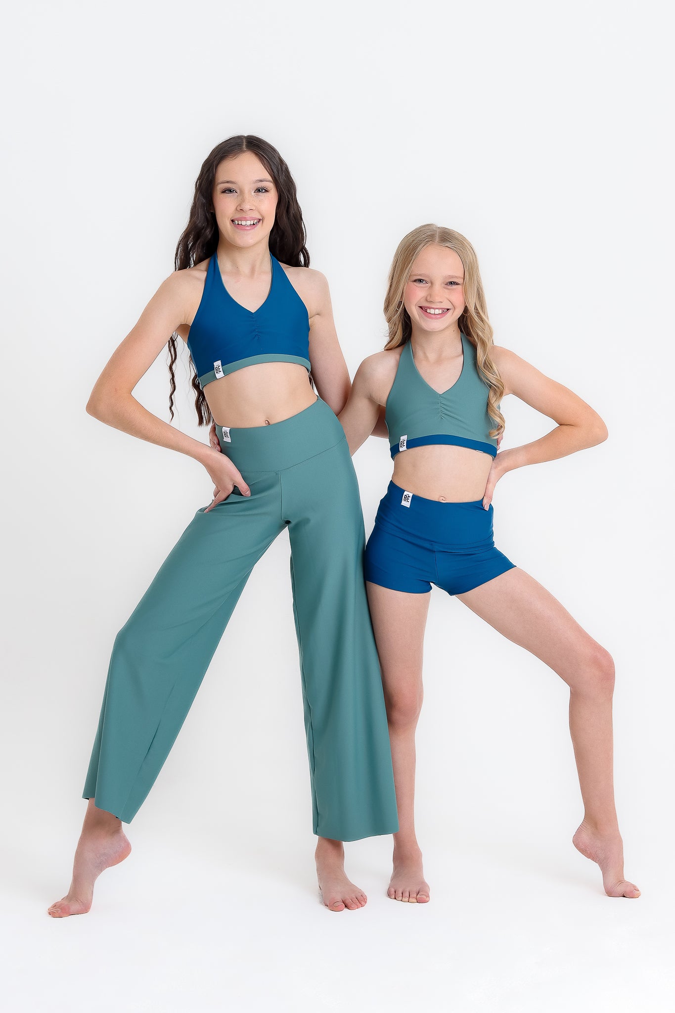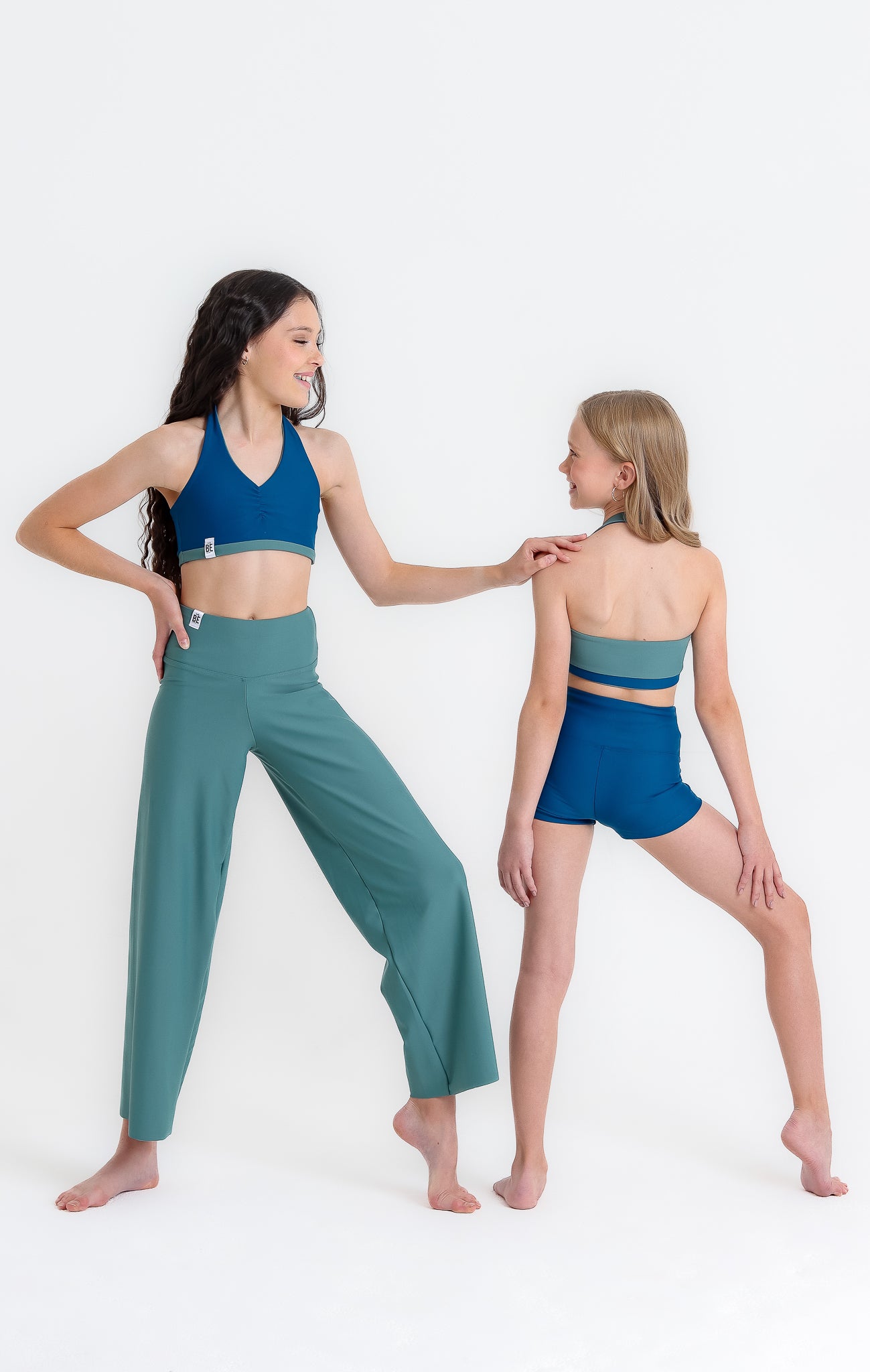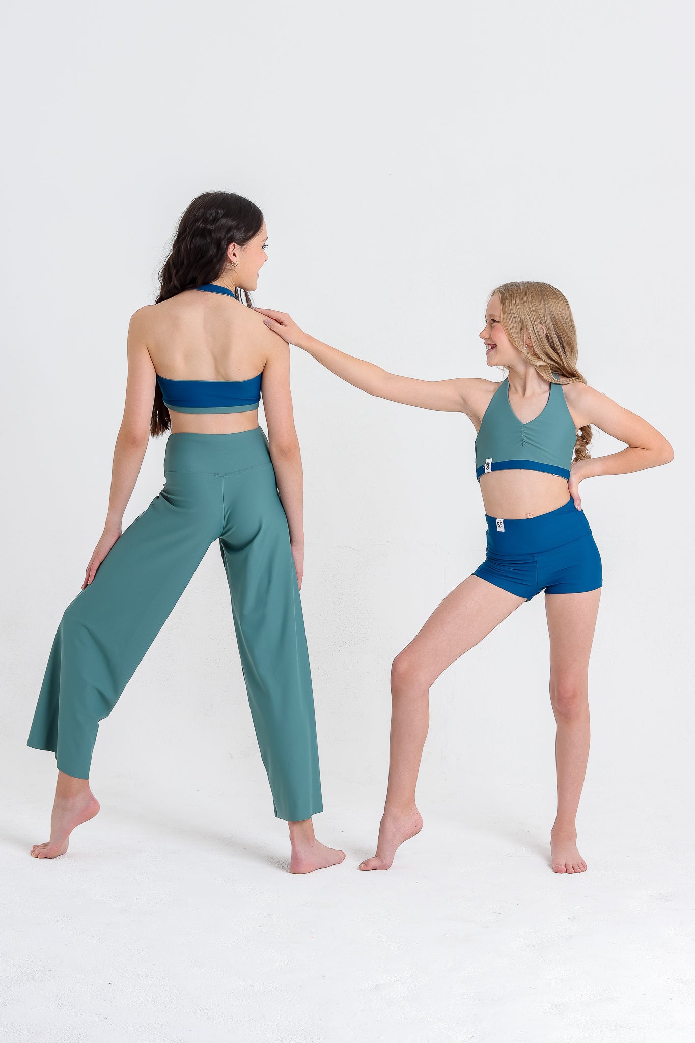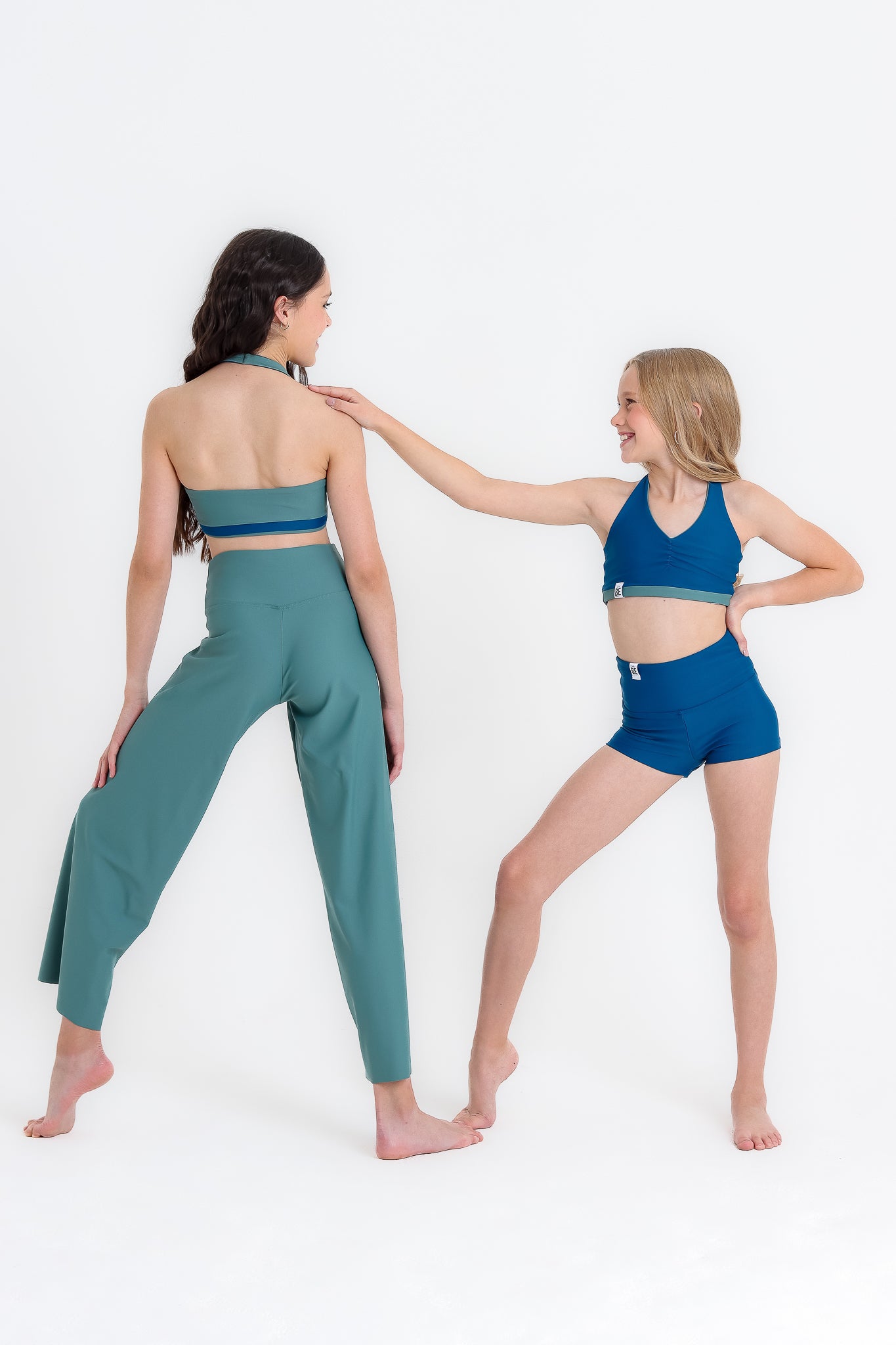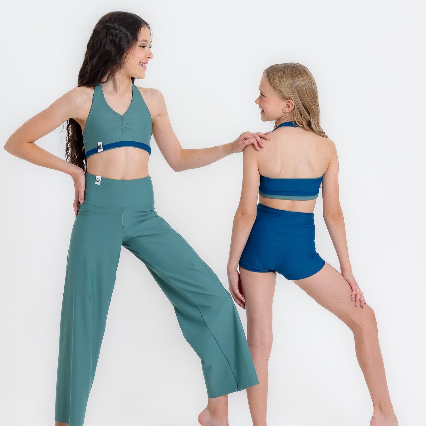 Two of our most popular colors team up in one reversible dance top. The masterfully designed Peacock and Cacti Swap Halter is not only super comfy, but oozes versatility. Combined with 4 different peacock and cacti BEversatile bottom options, your Swap Halter gives you 8 distinct looks…But for even MORE flexibility, pair your Cacti green and Peacock blue Swap Top with either the Cacti or Peacock Booty Briefs or Midi Shorts from the BErefined collection for a play on texture. Different fabrics, same colors.