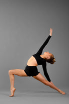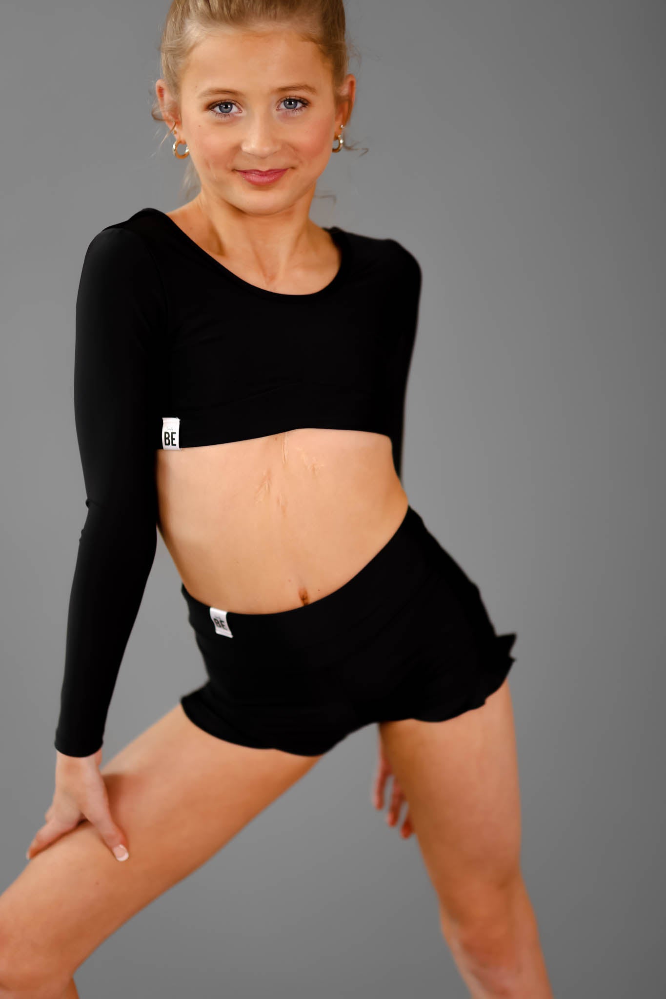 This long-sleeve dance top features a crop top design, scoop neck, and form-fitting arm emphasizing your gorgeous lines to the tips of your fingers. Pairs exceptionally well with coordinating Infinity Briefs, Finley’s Fave Briefs, and My Girl Shorties.